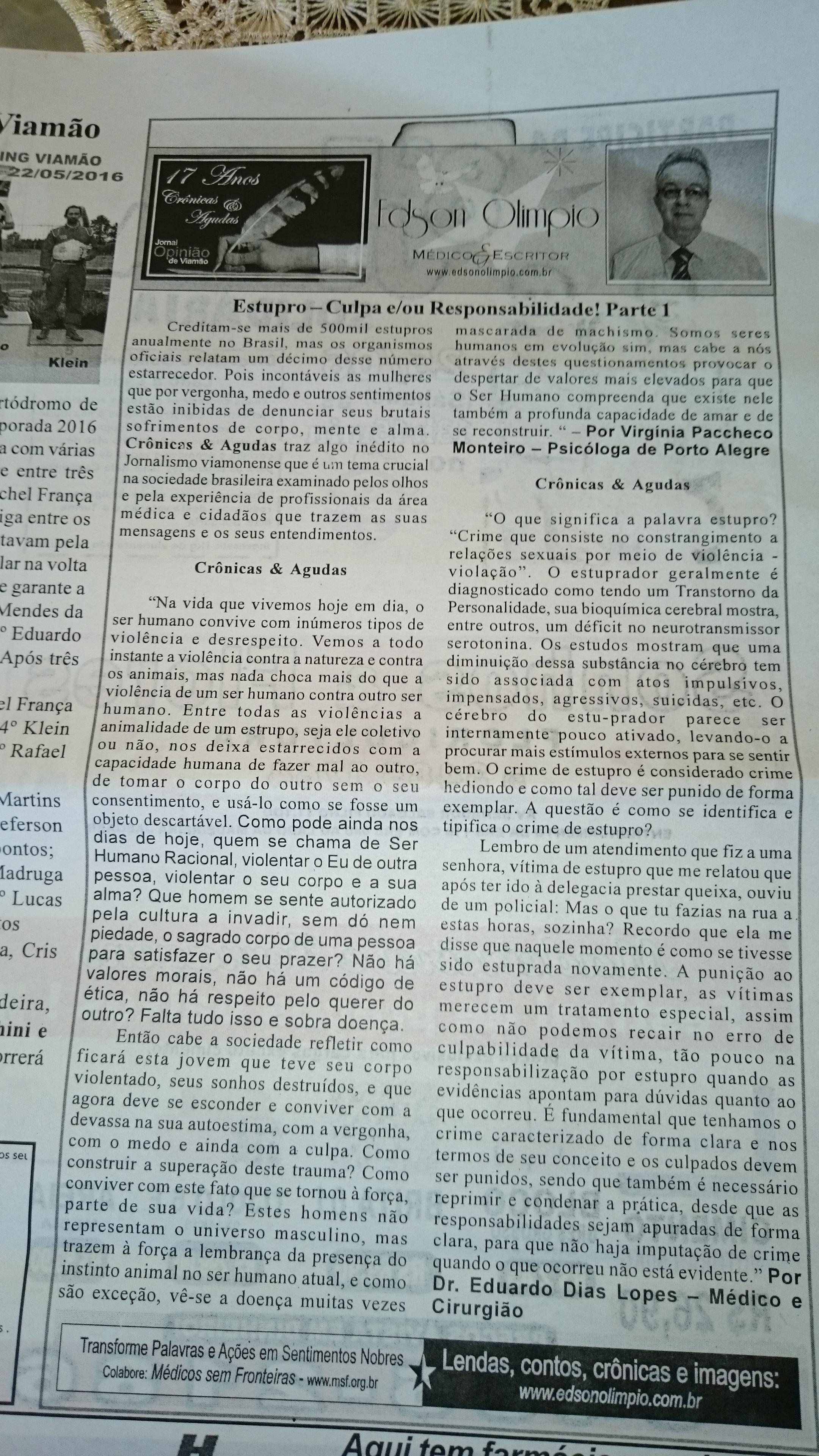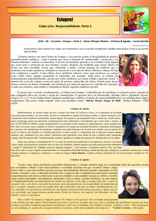 2016 – 06 – 21 Junho – Estupro – Parte 3 Conclusão – Edson Olimpio Oliveira – Crônicas & Agudas – Jornal Opinião