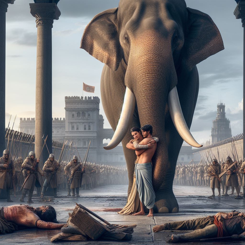 Estava Sidarta Gautama, Buda, aprisionado e com a exigência de abdicar de suas ideias e ensinamentos para salvar a sua vida. Não retrocedia e não se subjugava. Enquanto isso o rei ia executando outros prisioneiros e de sua janela da cela ele assistia a matança. A execução consistia de elefantes treinados, gigantescos, que sob o comando do seu treinador esmagava os crâneos, as cabeças, dos prisioneiros vivos. O povo todo à volta. Um frenesi típico domina multidões nessa situação mortal. O prisioneiro é trazido violentamente para aquela arena fatal, feras ululando, pessoas chorando, restos mortais de ossos e cérebros ensanguentados nos pisos de pedras e barrotes de madeira. E mais e mais pessoas esmagadas. Como Sidarta não aceita as ordens daquele rei maligno, é levado para a morte brutal. Sidarta chega com a calma dos justos, com o olhar dos iluminados. É colocado na posição para ser pisoteado. Aí acontece o imprevisível. O elefante não aceita a ordem fatal, revolta-se, como outros, a atacam seus treinadores e soldados. E o elefante ajoelha-se ante Sidarta e o envolve com sua imensa tromba protetora.