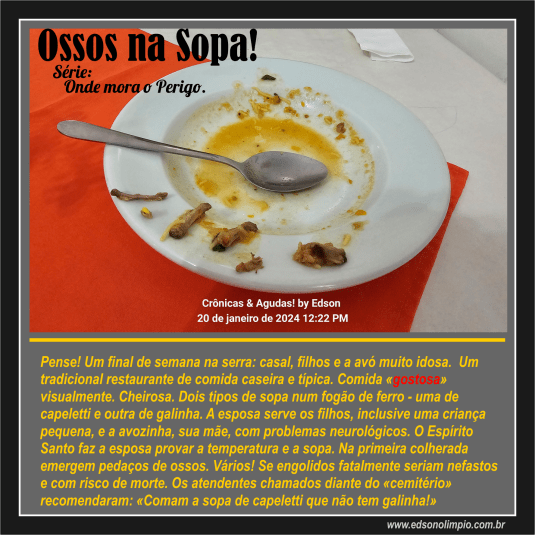 Começam pela sopa. A mãe prepara a sopa de galinha para a avó e para sua criança de poucos anos. Pense na satisfação desse casal e na mãe servindo seus filhos e sua mãe. O que há abaixo da superfície dessa bela e atrativa sopa de galinha com vegetais. O anjo da/de guarda fez com que a mãe-mulher provasse a sopa de galinha antes. E na primeira colherada vieram dois fragmentos de ossos, prontos para perfurar o esôfago se engolidos. Logo ela descobriu vários outros fragmentos de ossos de galinha. Chamou os atendentes e mostrou o cemitério de ossos. Para variar, a explicação passou por: “Comam a sopa de capeletti que não tem galinha!”