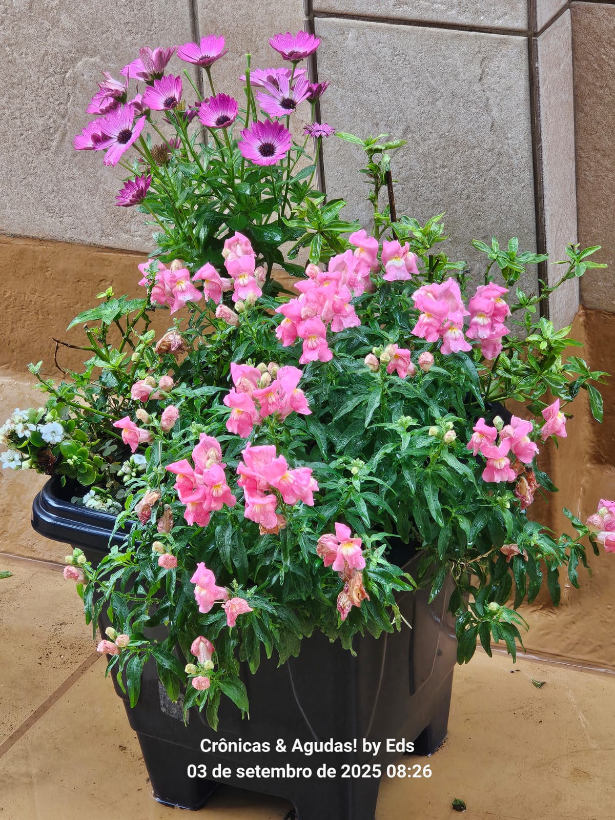 Chuva mansa. Em tempos tão sombrios para nossa Pátria, lágrimas do Céu trazem Vida e Esperança nas bocas-de-leão e crisântemos.